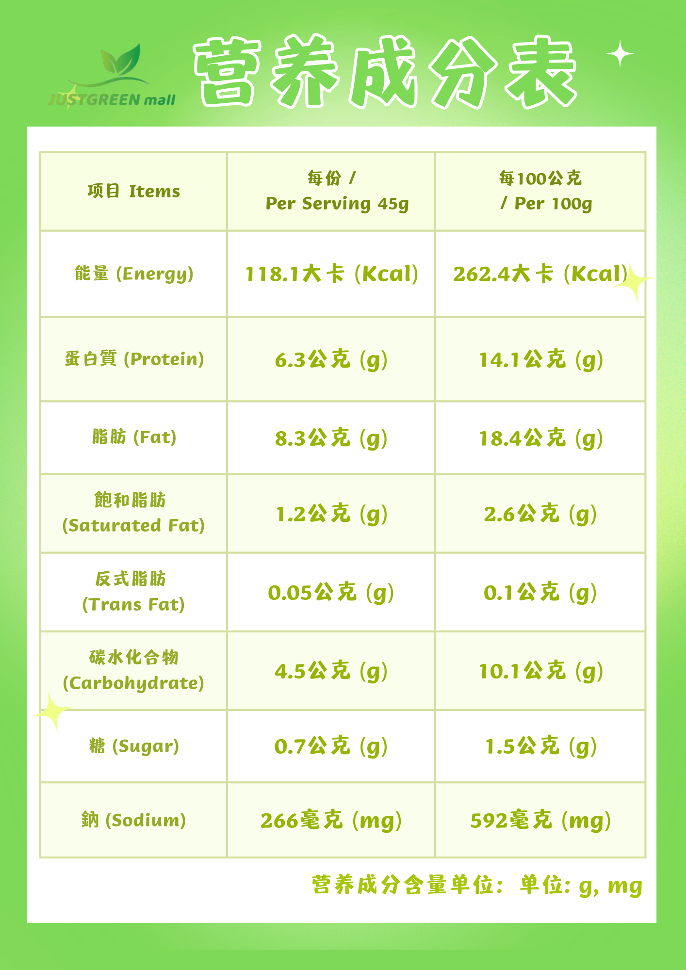 配料成分 水、組織狀大豆蛋白(非基因改造)(大豆、麩質)、分離大豆蛋白(非基因改造)(大豆)、大豆油、醬油(大豆、麩質)、蛋白粉(蛋白)、 小麥蛋白(麩質)、二砂、修飾澱粉(醋酸澱粉、羥丙基磷酸二澱粉) 、素食香料、酵母精粉、素食調味料(L-麩酸鈉、甘草酸鈉(甜味劑)、DL-胺基丙酸、5-次黃嘌呤核苷磷酸二鈉、5'-鳥瞟呤核苷磷酸二鈉、琥珀酸二鈉、 樹薯澱粉、黑胡椒、白胡椒、紅麴米粉