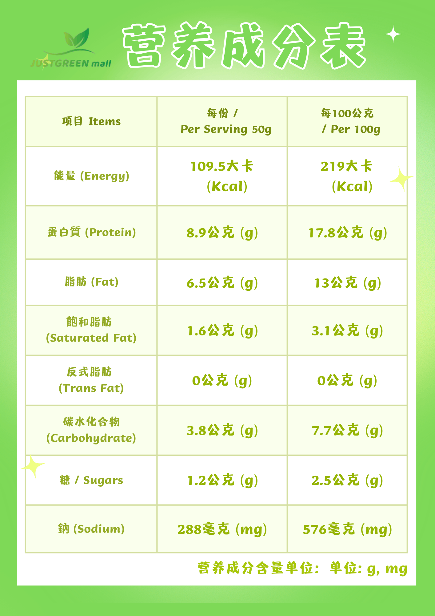 配料成分 水、組織狀大豆蛋白(非基因改造)(大豆、麩質)、起士(牛奶)、大豆油、醬油(大豆、麩質)、小麥蛋白(麩質)、蛋白粉(蛋白)、修飾澱粉(醋酸澱粉)、二砂、素食調味料(L-麩酸鈉、甘草酸鈉(甜味劑)、DL-胺基丙酸、5'-次黃嘌呤核苷磷酸二鈉、5'-鳥嘌呤核苷磷酸二鈉、琥珀酸二鈉)、素食香料、碘鹽、紅麴米粉