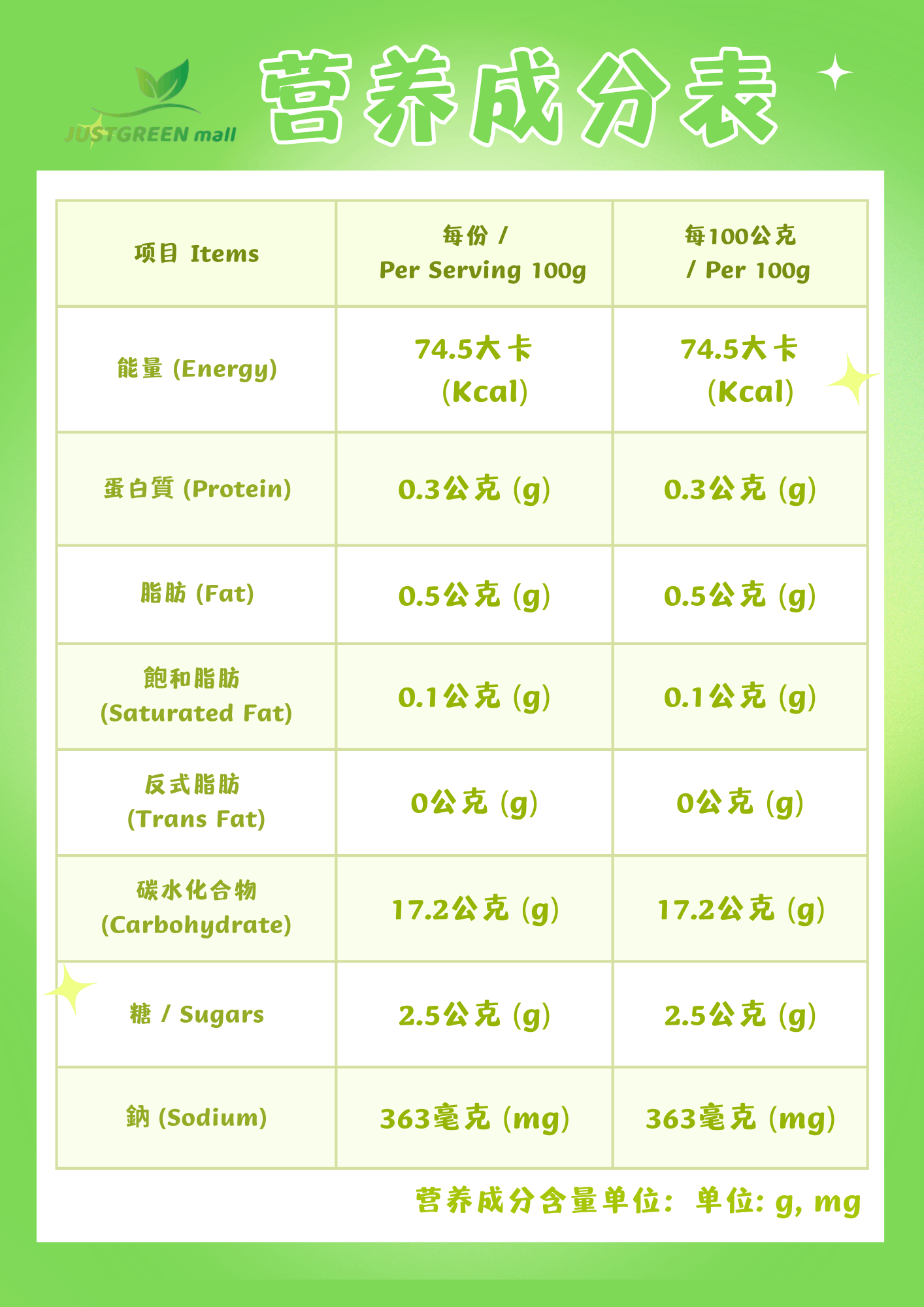 配料成分 水、羥丙基磷酸二澱粉、磷酸二澱粉、糖、大豆油、蒟蒻粉、醋酸澱粉、鹽、小麥纖維、卡德蘭膠、D-山梨醇、L-麩酸鈉、酵母粉、辛烯基丁二酸鈉澱粉、二氧化鈦、氫氧化鈣、氧化鈣、5'-次黃嘌呤核苷磷酸二鈉、5'-鳥嘌呤核苷磷酸二鈉、香料、紅椒色素、碳酸鈉