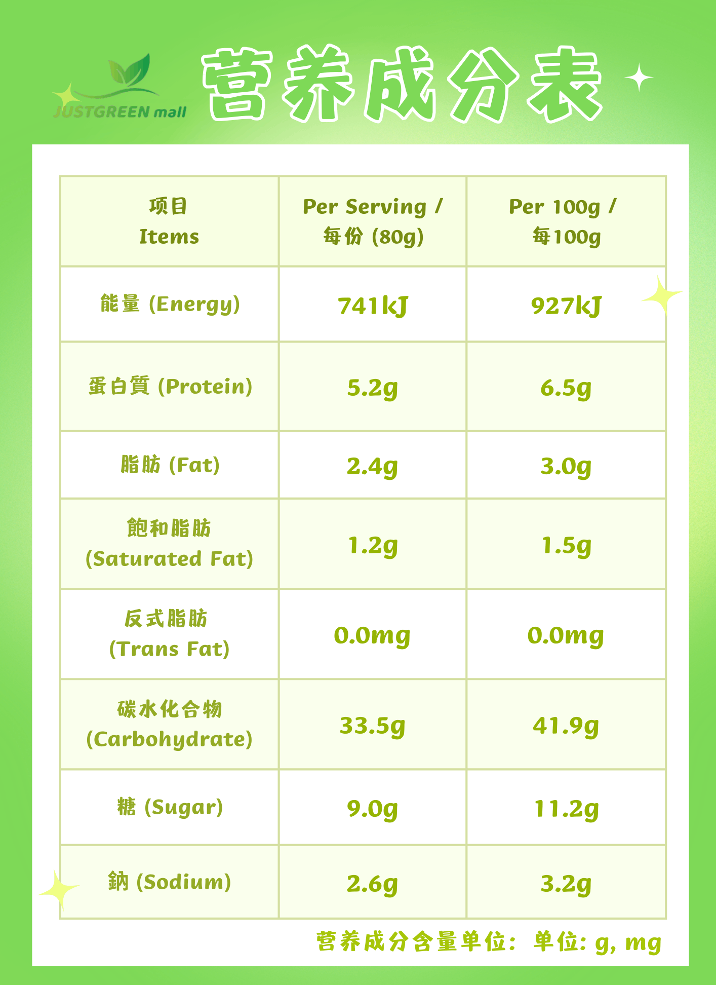 配料成分 澱粉 37%)、水(32%)、複水大豆蛋白(10%)(水、大豆分離蛋白、麵粉、麵筋)、糖、麵筋、植物乳膠(水、植物脂肪 (棕油基)、(氫化的)、糖、乳化劑(聚甘油脂肪酸酯))、香料、素調味品、複水香菇蒂、食用色素(碳酸氫銨、碳酸鎂)、酵母、香菇、植物油(棕油)、呈味劑(谷氨酸鈉)、麵粉處理劑(抗壞血酸)(又名維生素C))、鹽、芝麻油、著香劑(琥珀酸、5'-鳥苷酸二鈉/5’-肌苷酸二鈉、黃原膠(又名漢生膠))、甜味劑(山梨糖醇)、稠化劑(加工瓊芝屬海藻膠)