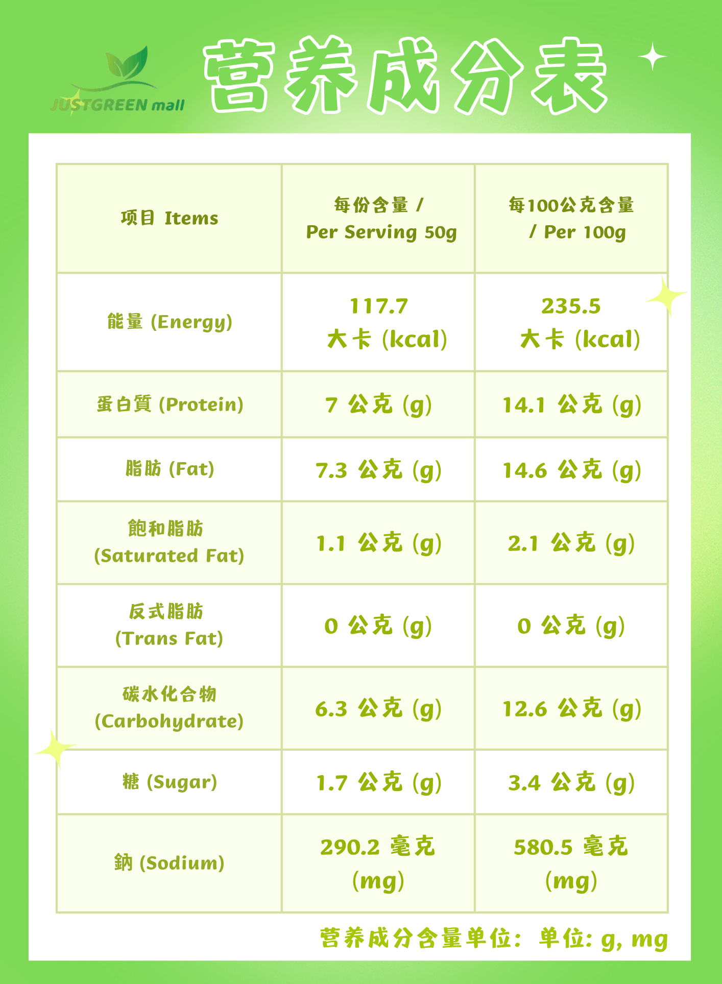 配料成分 水、組織狀大豆蛋白(非基因改造)(大豆)、大豆油、蛋白粉(蛋白)、二砂、酵母精粉、素食調味料(L-麩酸鈉、DL-胺基丙酸、5‘-次黃嘌呤核苷磷酸二鈉、5'-鳥嘌呤核苷磷酸二鈉、琥珀酸二鈉、胺基乙酸)、分離大豆蛋白(非基因改造)(大豆)、碘鹽、修飾澱粉(醋酸澱粉)、紅麴米粉、豆皮(非基因改造)(大豆)、素食香料、昆布抽出物